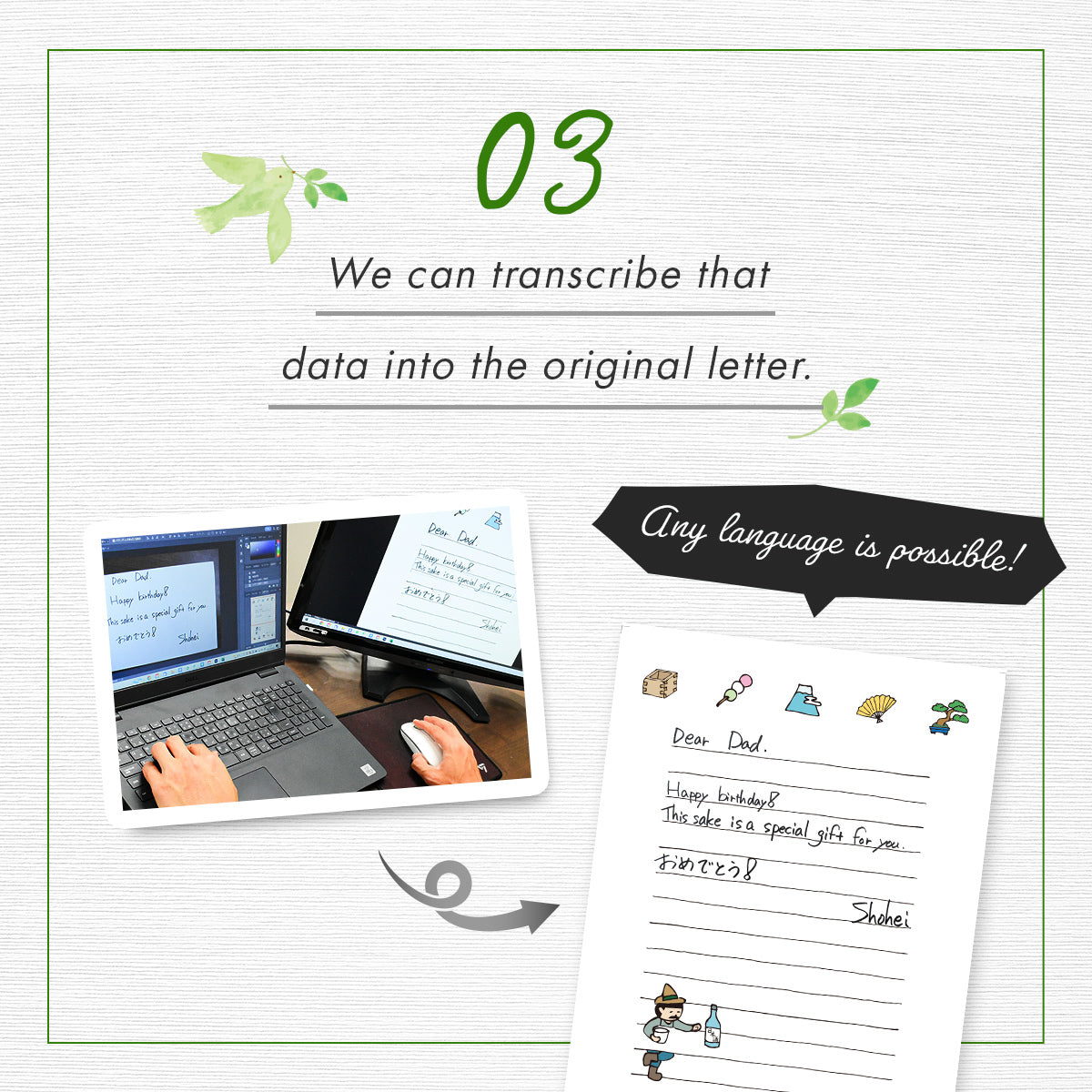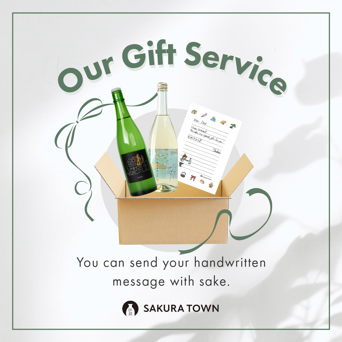 We can deliver sake worldwide and send a handwritten letter along with it.